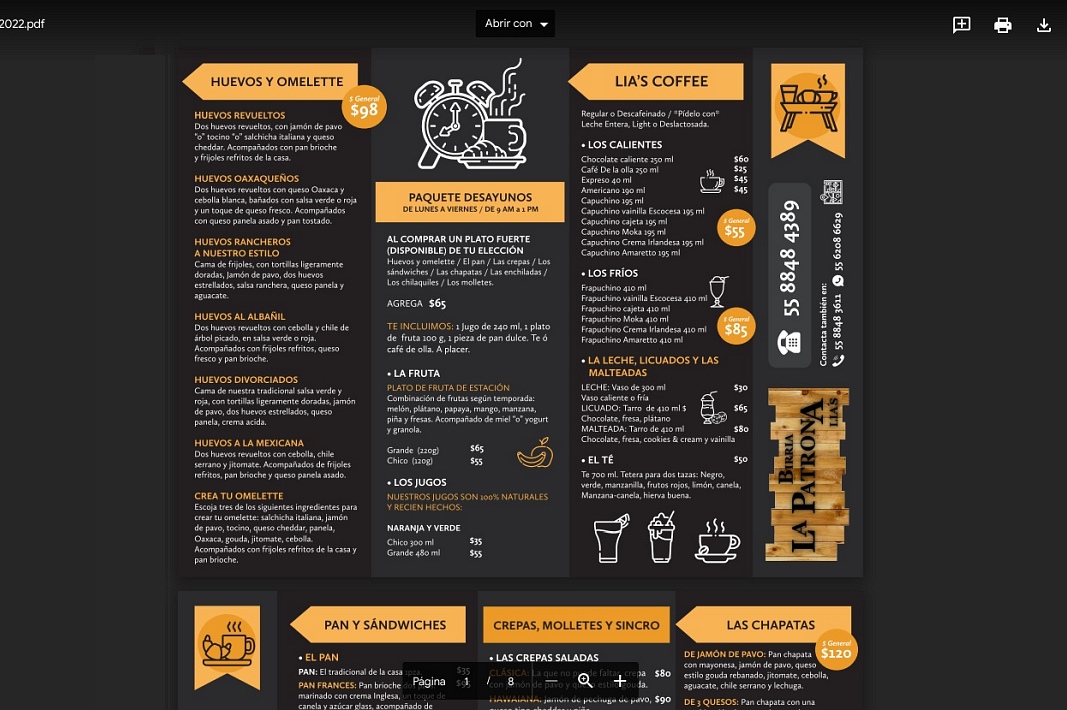 Accede y mira directamente en tu navegador, móvil, tablet, o baja el PDF del Menú, donde podrás ver en alta definición los contenidos del mismo: Precios, imágenes, detalles, ofertas y promociones!
